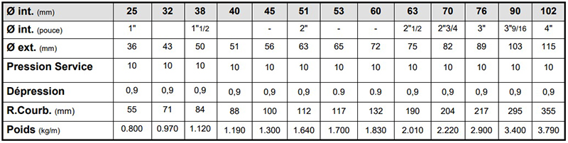 - Tube intérieur : EPDM blanc lisse alimentaire, inodore, renforcé d’une double spire métallique noyée.