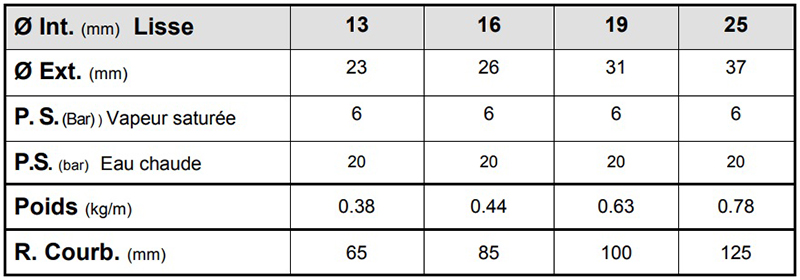 - Dimensions tuyau vapeur, eau chaude 165°C maxi
